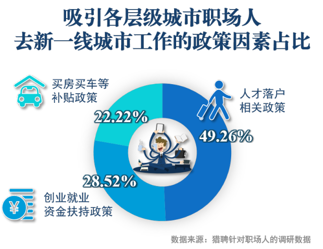 为了推动城市发展,吸引更多人才,杭州作为新一线城市代表近来出台了一系列招才引智的相关政策。经过调研发现,在这些政策中,想去新一线的职场人表示最吸引他们的是落户相关政策,选择该项的人才占比位居第一,为49.26%;创业就业扶持政策占比位居第二,为28.52%;买房、买车等补贴政策占比第三,为22.22%。