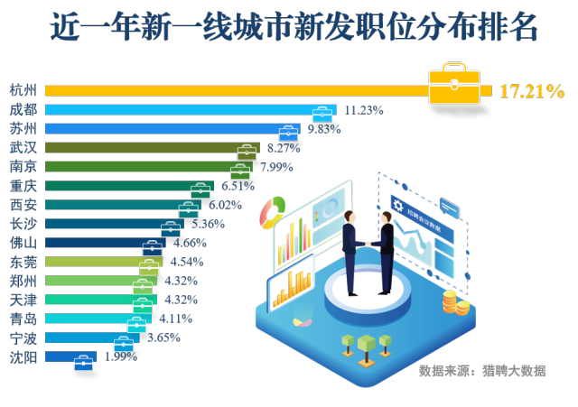 从近一年15个新一线城市的新发职位分布来看,杭州占比最高,为17.21%,位居第三至第五的的是苏州、武汉,南京,占比分别为9.83%、8.27%、7.99%。其他城市均低于7%。