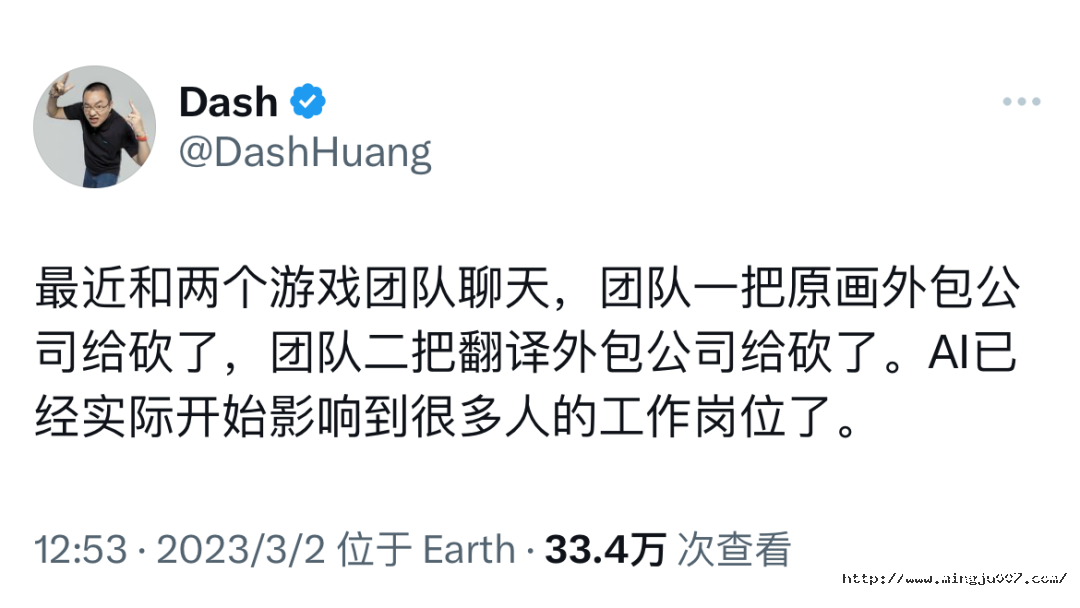 早在3月初,心动网络创始人黄一孟在海外社交媒体上爆料:“最近和两个游戏团队聊天,团队一把原画外包公司给砍了,团队二把翻译外包公司给砍了。AI已经实际开始影响很多人的工作岗位。”